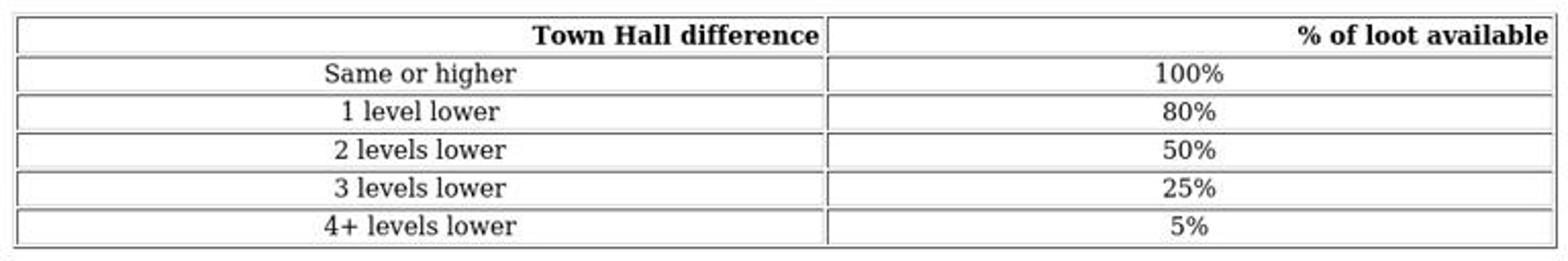 Those on two levels below happen somewhat more often, with a probability of about 2-8%, which tends to decrease as your town hall level rises, though at maximum town hall levels, this can climb back to around 5%.
