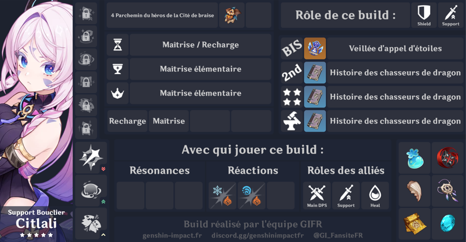 Citlali excelle dans le déclenchement des réactions de fonte et de gel grâce à sa capacité à appliquer rapidement l’élément cryo, ce qui en fait une alliée précieuse dans les équipes axées sur ces mécanismes. Pour maximiser son efficacité, il est conseillé de l’intégrer avec des personnages pyro ou hydro, qui complètent ses capacités.