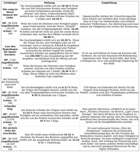 Die Bein-Reliquie „Möge der Abschied schön sein“ oder die Leichte „Sternenlicht in der Dunkelheit“ bieten Gesundheit und Boni für den Schaden von Verbündeten, werden aber oft später durch Signaturen ersetzt.