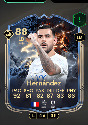 Theo Hernández's Thunderstruck card is a formidable Left Back, boasting an impressive overall rating of 88. With a blistering pace of 92 and exceptional dribbling at 87, he excels as a sharp attacking full-back, capable of racing down the flank to quickly tear apart the opposing team's defense. Complemented by solid shooting (81), passing (82), defense (83), and physicality (86), this card allows him to not only create opportunities but also seize them to score crucial goals and help seal the deal in any match.
