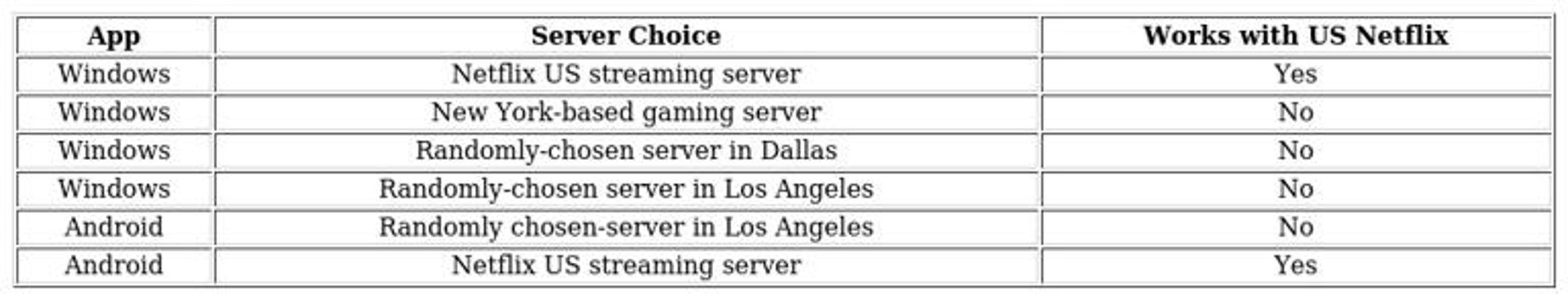 Below, we've detailed our comprehensive testing methodology and results. For those seeking a quick overview, we've compiled our key findings in a reference chart that highlights the most important aspects of CyberGhost's performance with Netflix.
